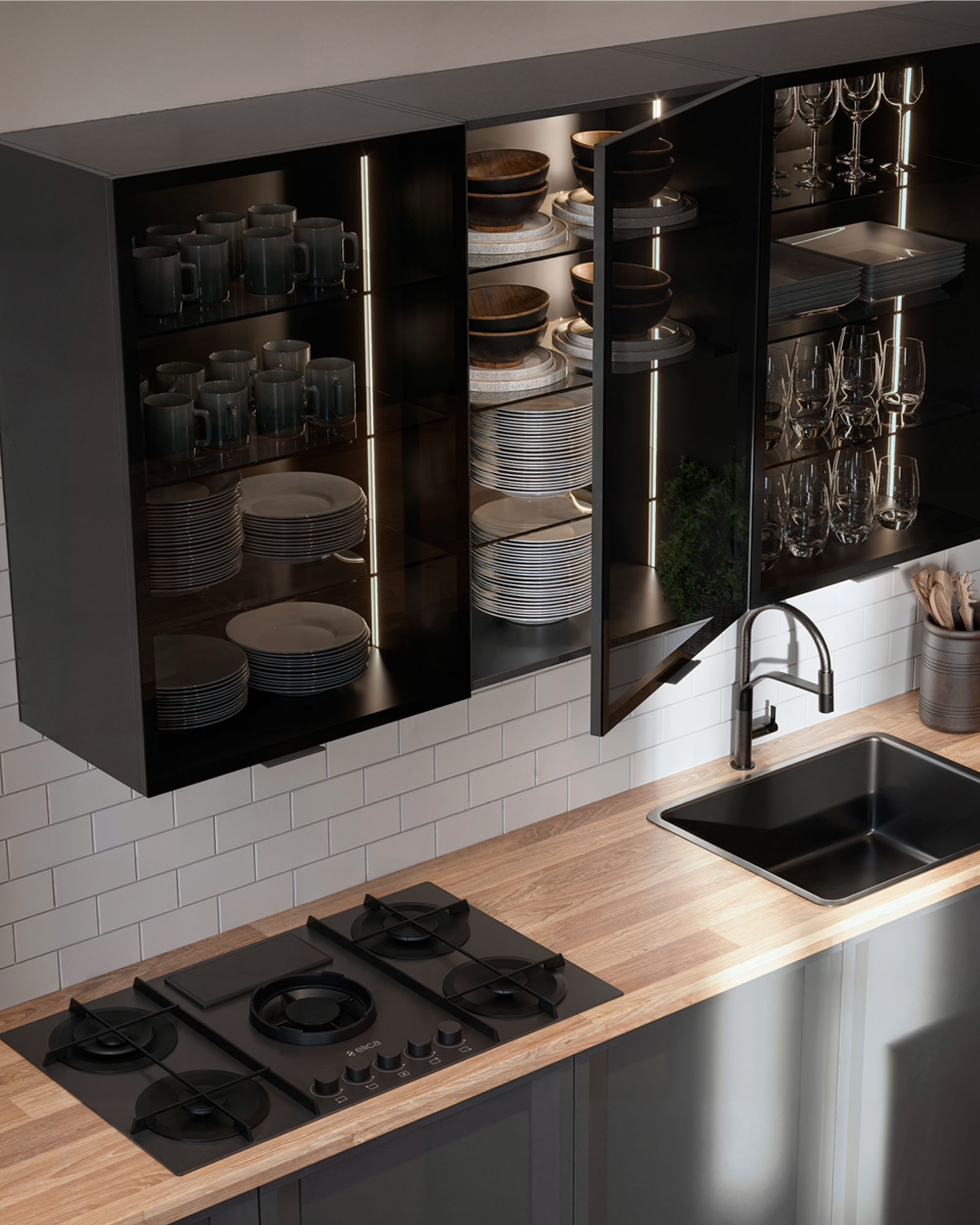 Las vitrinas retroiluminadas evocan las cocinas de inspiración francesa y añaden una luz cálida al ambiente. Cada detalle contribuye a crear un espacio elegante, sereno y con el encanto de lo natural.